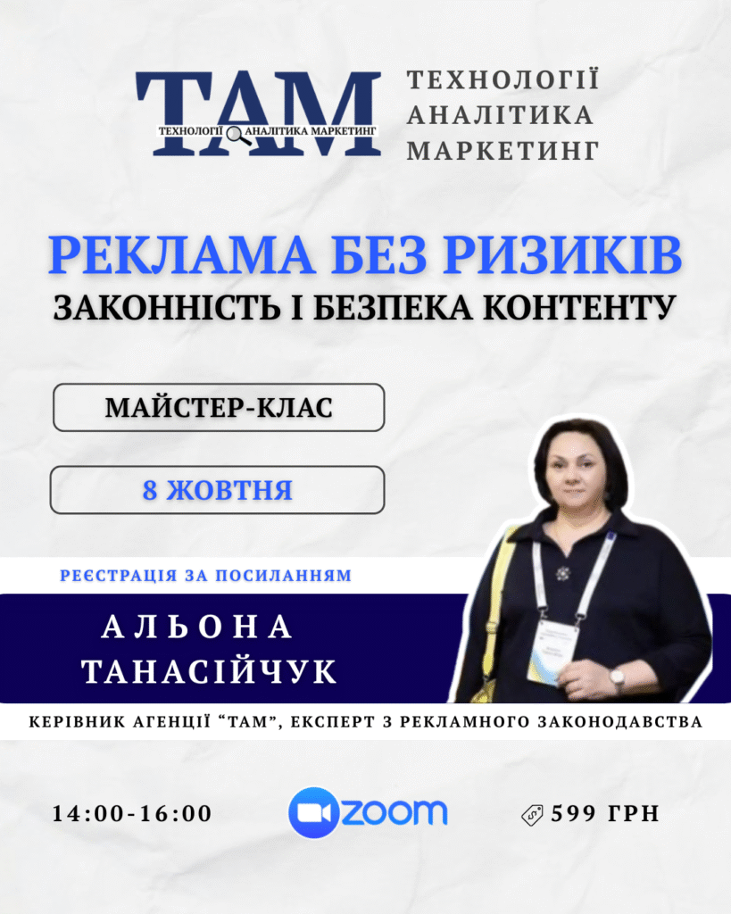 👩💼 Спікер: Альона Танасійчук — керівник агенції “TAM”, експерт з рекламного законодавства.